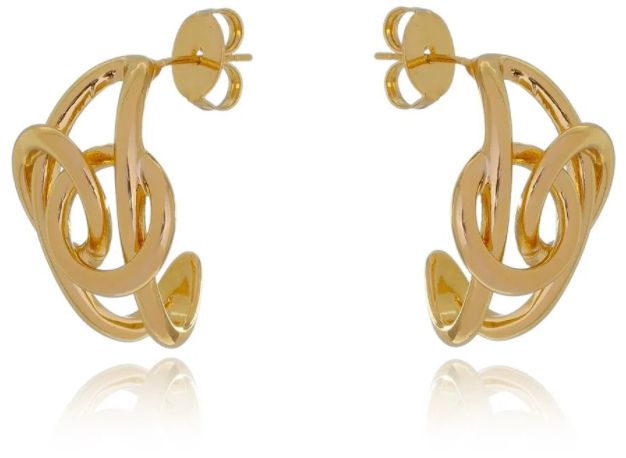 Brinco pequeno de meia argola com aros entrelaçados vazados. Disponível no banho de ouro amarelo 18K. Largura: 2,4cm Peso do par: 9,6grs Comprimento : 5cm