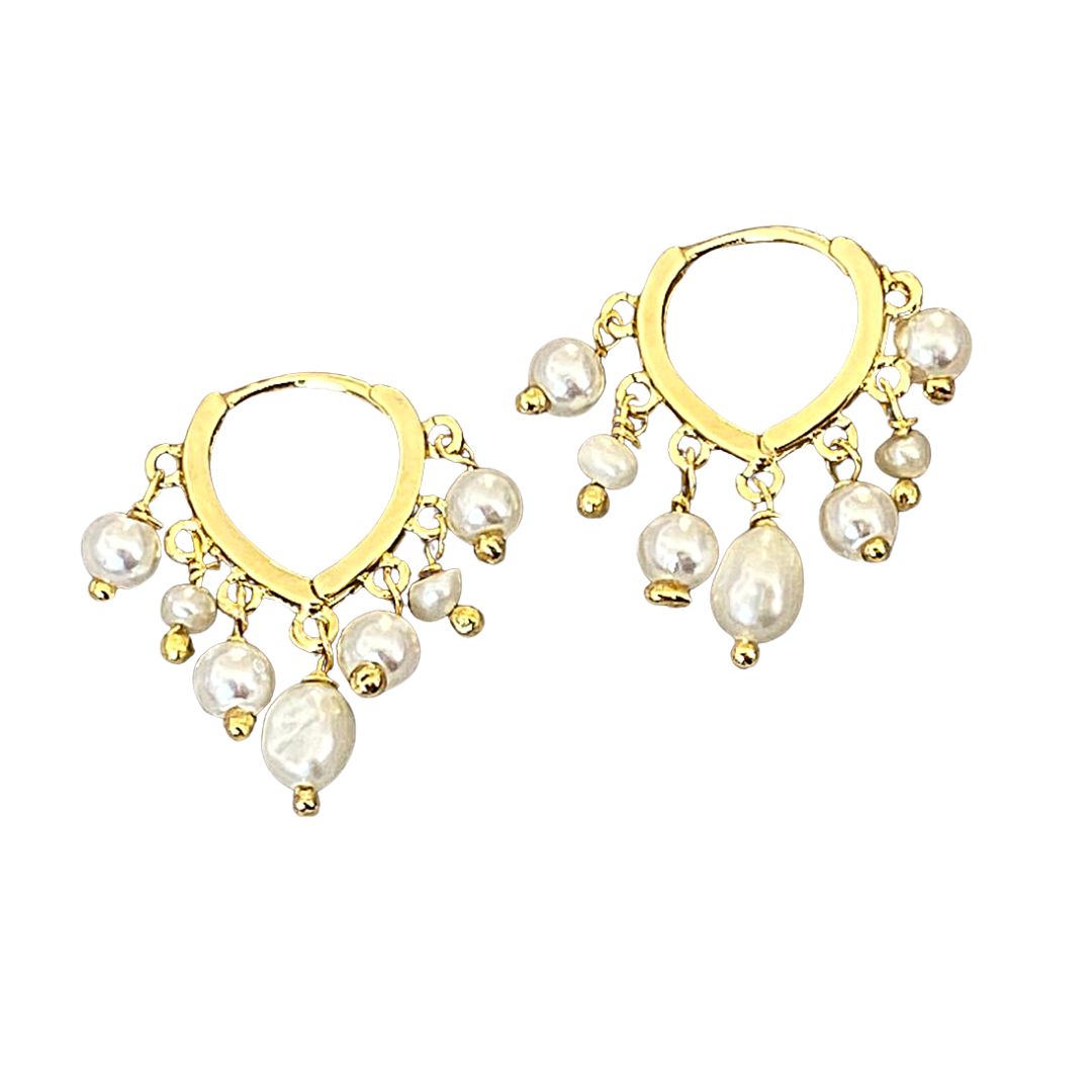 BRINCO MODELO ARGOLA EM FORMATO DE CORAÇÃO, EM BANHO DE OURO AMARELO, COM PINGENTES EM MODELO DE PEROLAS.