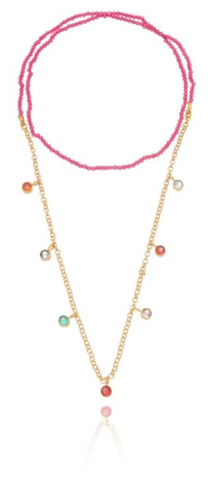 Colar curto com cristais pink e metade corrente de elos portugueses com detalhes de zircônias coloridas. Disponível no banho de ouro amarelo 18K.