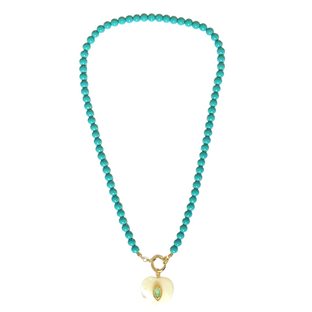 COLAR DE COR TURQUESA, COM PINGETE EM MADRE PEROLA NO FORMATO DE CORAÇÃO.