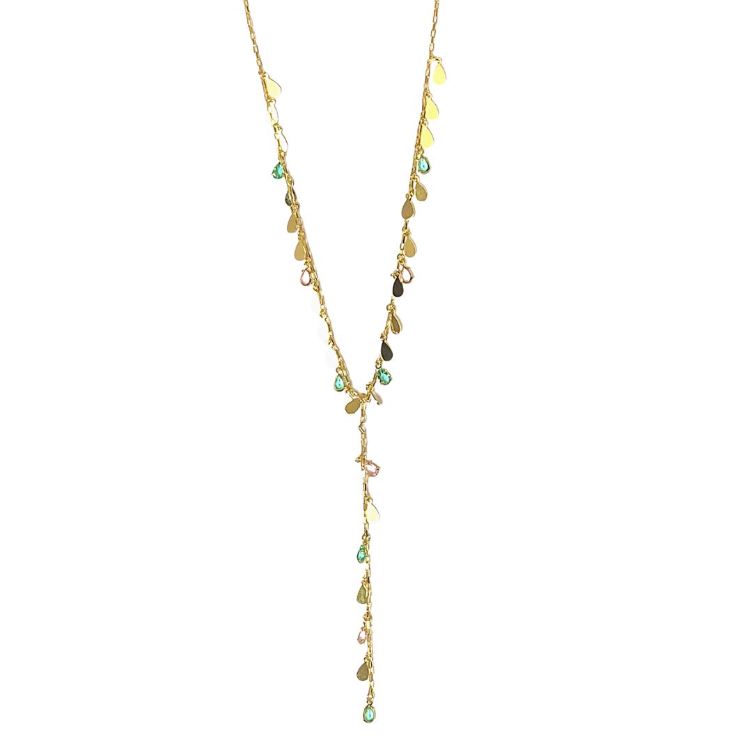 COLAR NO MODELO GRAVATINHA COM BANHO DE OURO AMARELO 18K, COM PLACAS DOURADAS E CRISTAIS COLORIDOS.